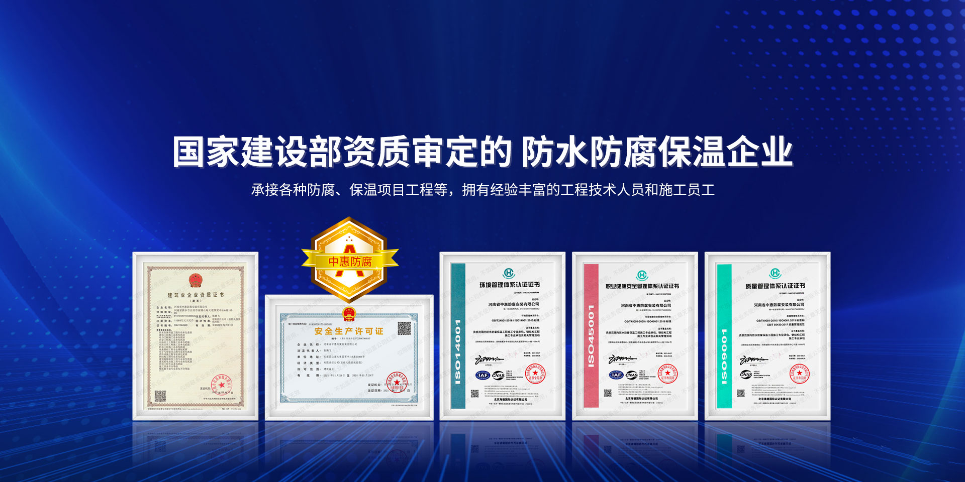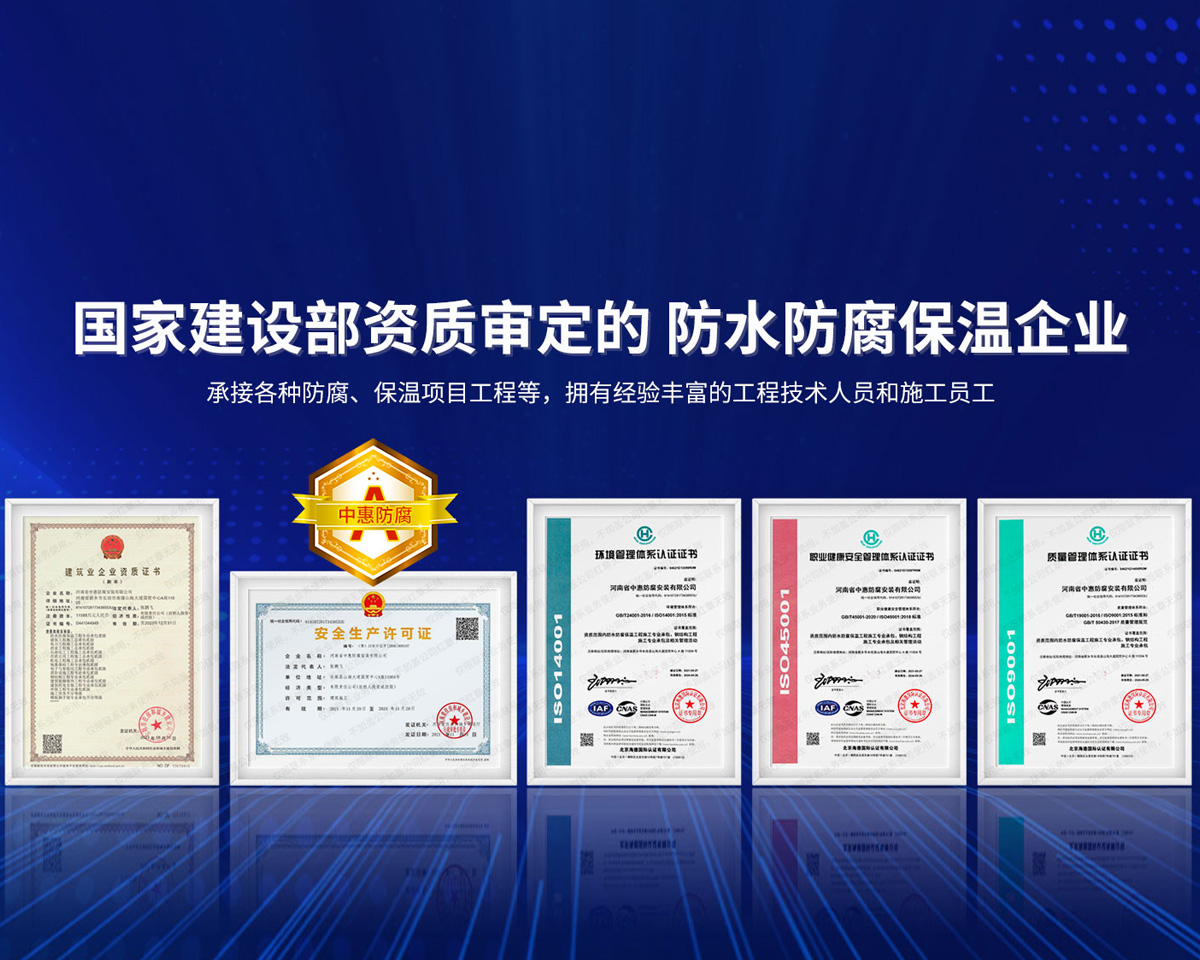 公司經營范圍:防水防腐保溫工程;消防設施工程;建筑裝修裝飾工程;建筑機電安裝工程;電力工程;建筑工程;石油化工工程;工業清洗工程;油罐清洗工程;鋼結構工程;環保工程;模板腳手架工程;電纜防火封堵、防污閃噴涂、外墻外保溫工程;各類施工勞務作業;設備維修、船舶鉚焊、涂裝;電力工程材料、建材、防水材料、防火材料、防腐保溫材料銷售,并相繼通過了GB/T19001-2008idtISO9001:2008GB/T50430-2007質量管理體系認證證書。GB/T24001-2004idtISO14001:2004環境管理體系認證證書。GB/T28001-2011idtOHSAS18001:2007職業健康安全管理體系認證證書。公司是中國防腐蝕于防護協會、中國施工企業管理協會、電力協會和中國鋼結構防水協會會員單位。 公司的經營業務涵蓋了石油、化工、電力、冶金、煤炭、船舶、國防、燃氣、水利、環保、交通運輸、航空及國防軍工和輕紡市政等行業的防腐保溫絕熱設備。鋼結構安裝、防火、防水、金屬噴鍍、聚脲噴繪、陰極保護、防滲透堵漏、玻璃鋼及各種磚版材料襯里、橡膠襯里、煙氣硫和耐酸溶劑腐蝕等工程施工。公司連續十年榮獲“省市先進施工企業”“安全生產先進單位”“重合同,守信用企業”和“AA***資質企業”的稱號。2000年被命名為市級文明單位,2002年被國家工商行政管理局命名為“重合同,守信用的企業”、被中國工業防腐蝕技術協會命名為“防腐蝕企業,能源節約及環境保護領域有豐富的經驗和***的業績。工程一次交驗合格率100%。其中攀枝花鋼鐵公司煉鐵廠四號高爐及熱風爐防腐工程、上海寶鋼公司煤氣柜防腐工程、撫順石油一廠裝置防腐項目、齊魯石化公司稀烴廠高塔防腐工程、吉林化學工業公司煉油廠油罐防腐工程、天津石化熱電廠六號爐頂棚聯絡管保溫工程、大慶油田(太倉)力神泵業工程、中國化學工程第十一建設工程、中原油田勘探局工程、中國石化銷售有限公司華北分部、魯皖輸油管道工程、貴州開磷息烽合成氨工程、陜西黃陵煤化工程、中國石油天然氣西部管道塔里木輸油工程、邯鋼集團邯寶鋼鐵公司煉鐵工程、德州供電工程、吉寶(南通)船廠工程,偃師華潤熱力工程、鄭州熱力總公司。 河南省中惠防腐安裝有限公司愿以豐富的施工經驗,***的技術,***的設備,***的管理,***的服務,竭誠為國內外廣大的用戶提供***滿意、******的工程作品。 我公司愿與國內外同仁一道,團結協作,共同推進防腐蝕行業發展! 公司地址:河南省長垣縣建設路北段360號 固定電話:0373-8866488 郵編:453400 網址:http://www_zhff_com_cn.ek62.com
